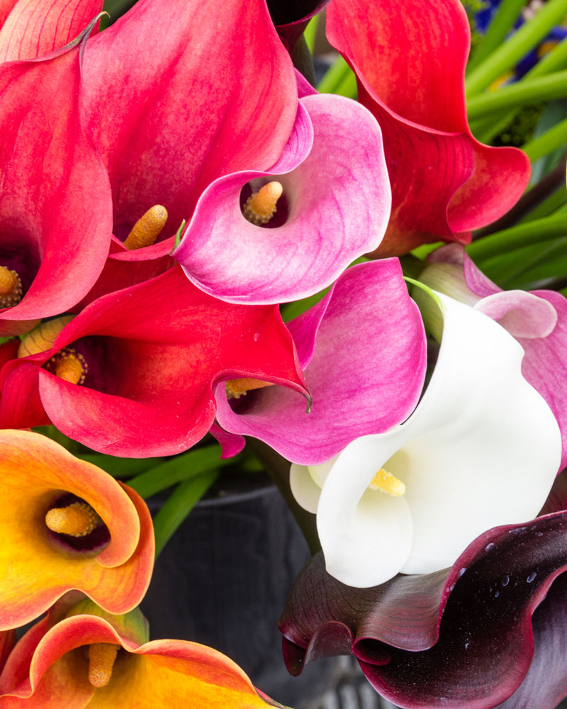 Calla flowers can come in a huge range of colors from purest white to deepest red. Many people love the exotic look of the almost-black cultivars, and others go for zesty oranges and bright yellows. The arrow-shaped foliage on many of these cultivars is decorative in its own right, displaying varying degrees of almost-translucent spotting on undulating leaves.