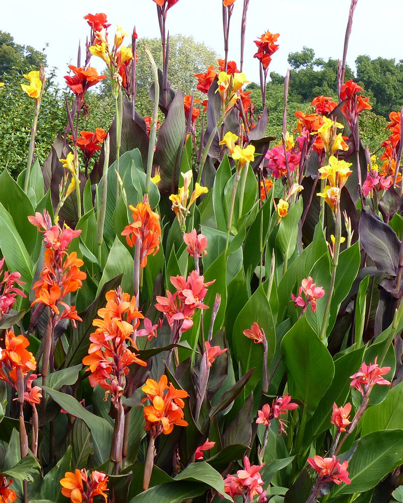 Keep the plants well watered and fertilized all summer. In cold climates, cannas and callas may not flower until late summer, but the show is worth the wait. Also, you can enjoy the colorful foliage in spring and summer. In fall, before a frost, dig up and store the bulbs indoors for replanting the following spring.