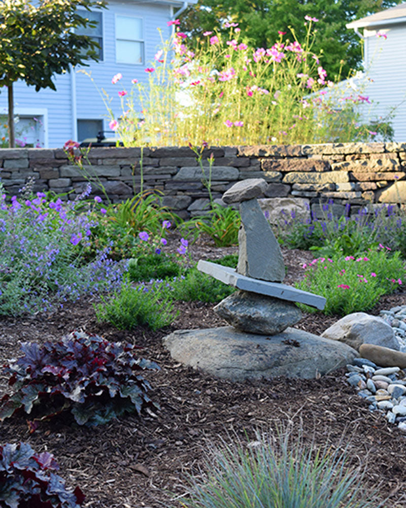 On top of the engraved stones, the family added Joe’s character in different ways throughout the memorial garden. “Part of my thought about the garden is we wanted there to be a little element of surprise and fun, which is why we worked the words into the wall,” says Liz. “We’ve also placed tiny stone figures you can find [hidden="hidden" throughout the landscape], and we’ve added little bells in the trees. So we hope there will be some whimsy and surprise in the garden, reflecting what Joe enjoyed.”