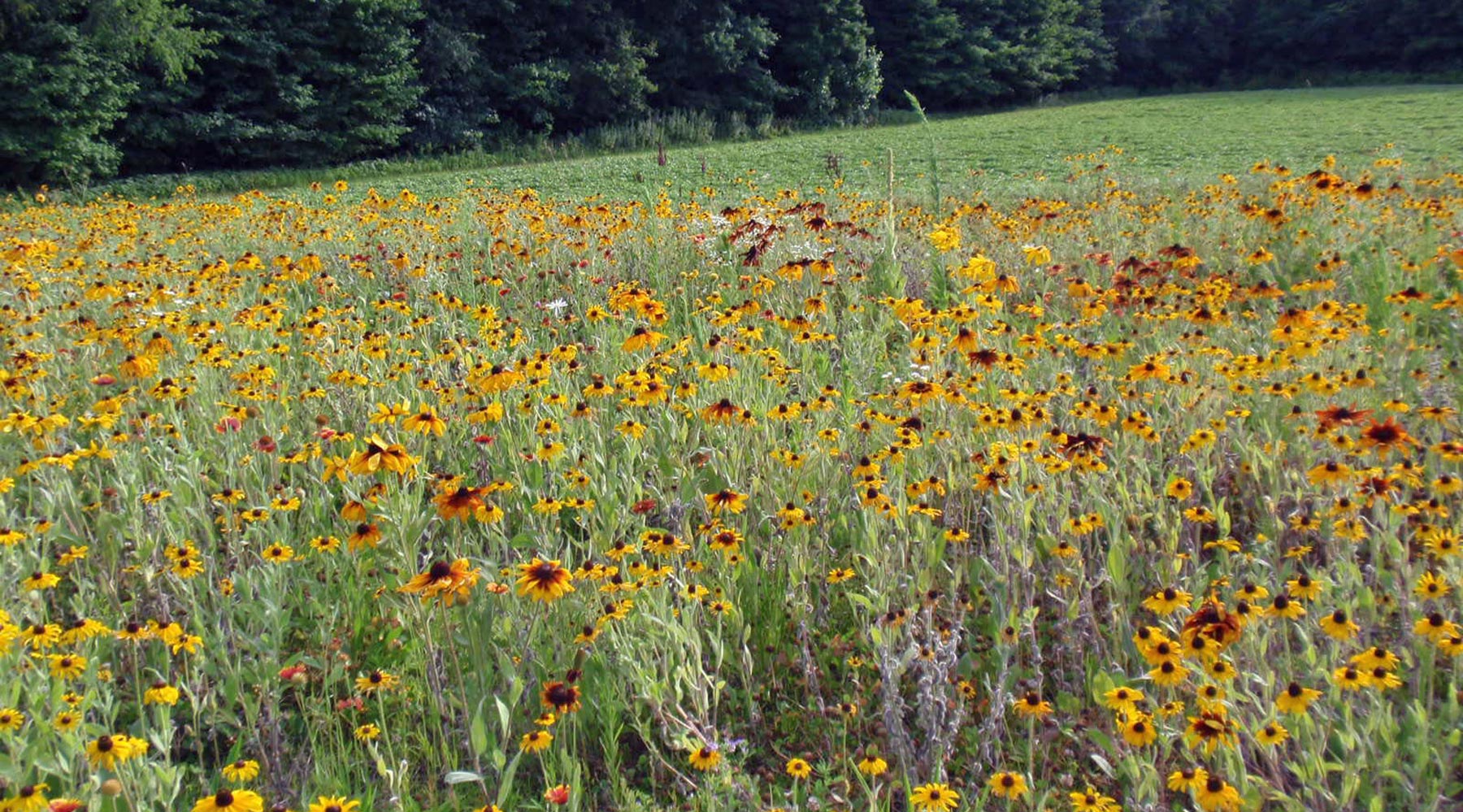 During mid-summer, the Sutton’s meadow is ablaze with .The Suttons found a beautiful piece of land in rural Michigan, and when their new home was built, wanted to preserve the rural character with wildflowers. Today, deer, wild turkeys, and a red-tailed hawk enjoy the flowers along with the homeowners. Here’s the story, as Mrs. Sutton wrote it for us.