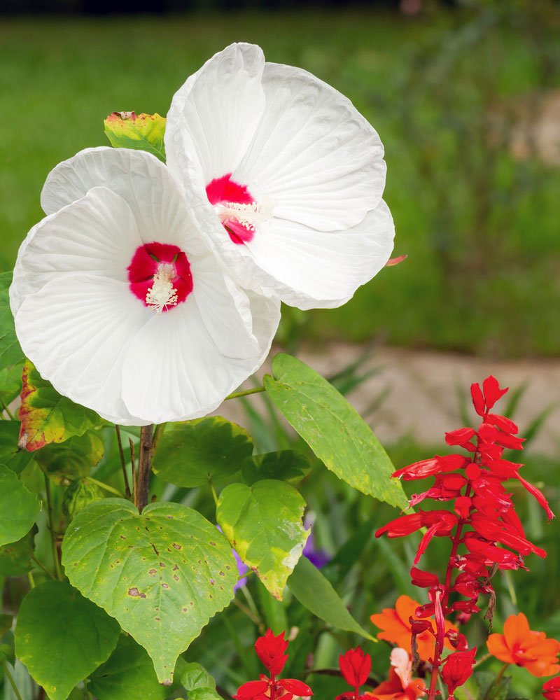 In 1955, Robert Darby from Maryland created "Lady Baltimore," and it's been a favorite ever since. His patent explains that both the Lord and the Lady were created by crossing at least four native hibiscus species: H. militaris, H. coccineus (the solid red one that is sometimes available), H. palustris (Palustris means "swamp" in Latin.), and the best known wild one, Hibiscus moscheutos.