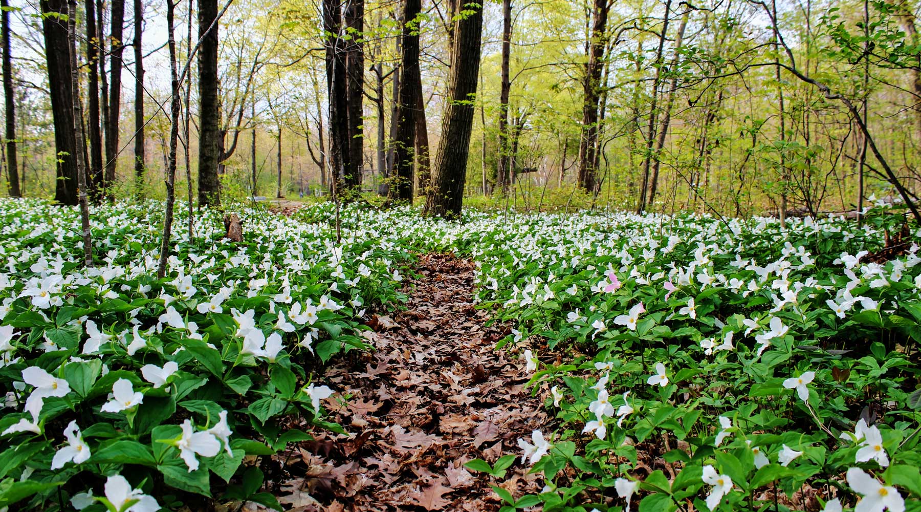 We’ve all seen (or possibly grown) an elegant shaded landscape featuring spiked Astilbe, colorful Bleeding Hearts, vibrant green Hostas, and more. These shade gardens have their place — rightfully so — in many landscapes, but while at the Philadelphia Flower Show last week I learned about another type of shade garden. A truly “no fuss” wild shade garden. A type of woodland shade garden that can be planted peacefully underneath your deciduous trees and purposefully forgotten about year after year until the ground is covered in native Trillium, Bloodroot, and more.
