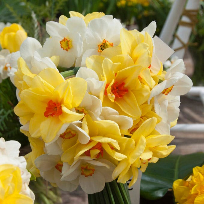 There are only a handful of choices among 'Poet's Daffodils'; they are so unique they create their own category among Dutch daffodil types. One is called 'Old Pheasant's Eye' for obvious reasons. But we chose 'Actaea' since we think it's a bit more beautiful. Both have the stunningly-colored short center cup in brilliant contrast colors against the flat background of pure white petals. You'll love this daffodil.
