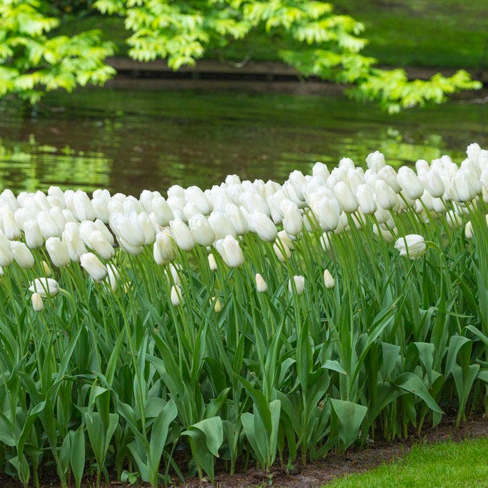 There are few flowers as simple and sophisticated as a single white tulip, and 'Snow White' Single Late Tulip, with tall stems and deep green sword-like foliage, is quite possibly the queen of all. This late cultivar extends the tulip season in the garden and adds a touch of elegance and effortless contrast to your most creative spring color experiments. An excellent choice for spring bouquets. (Tulipa)