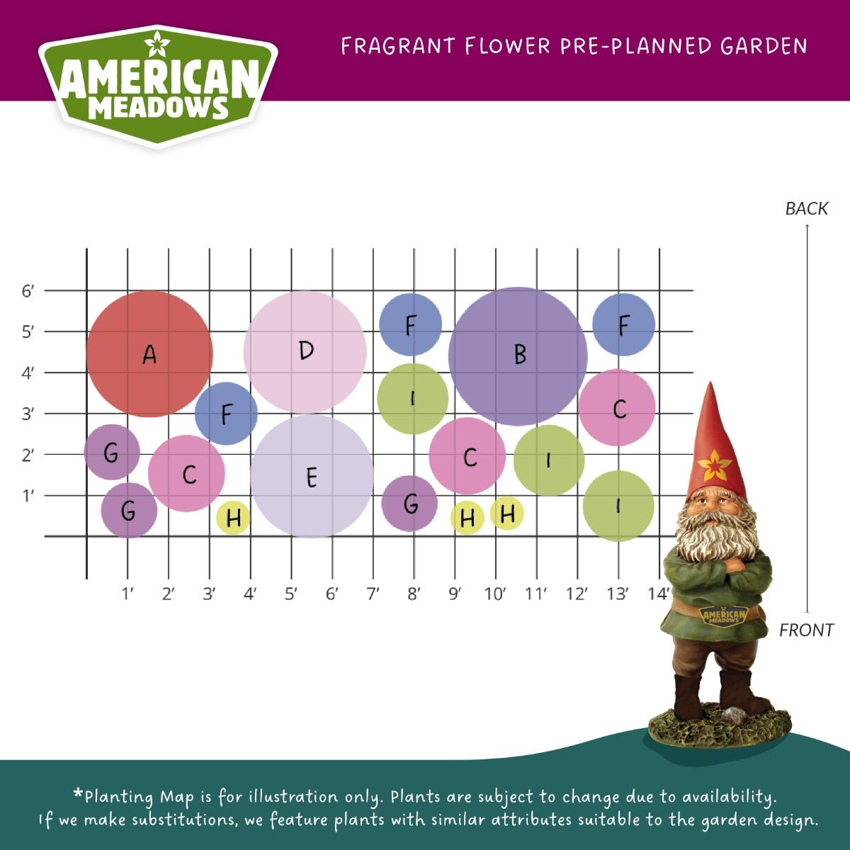Our Fragrant Pre-Planned Garden is designed to be roughly 6 x 14 ft and includes care instructions, a planting map and 19 plants: