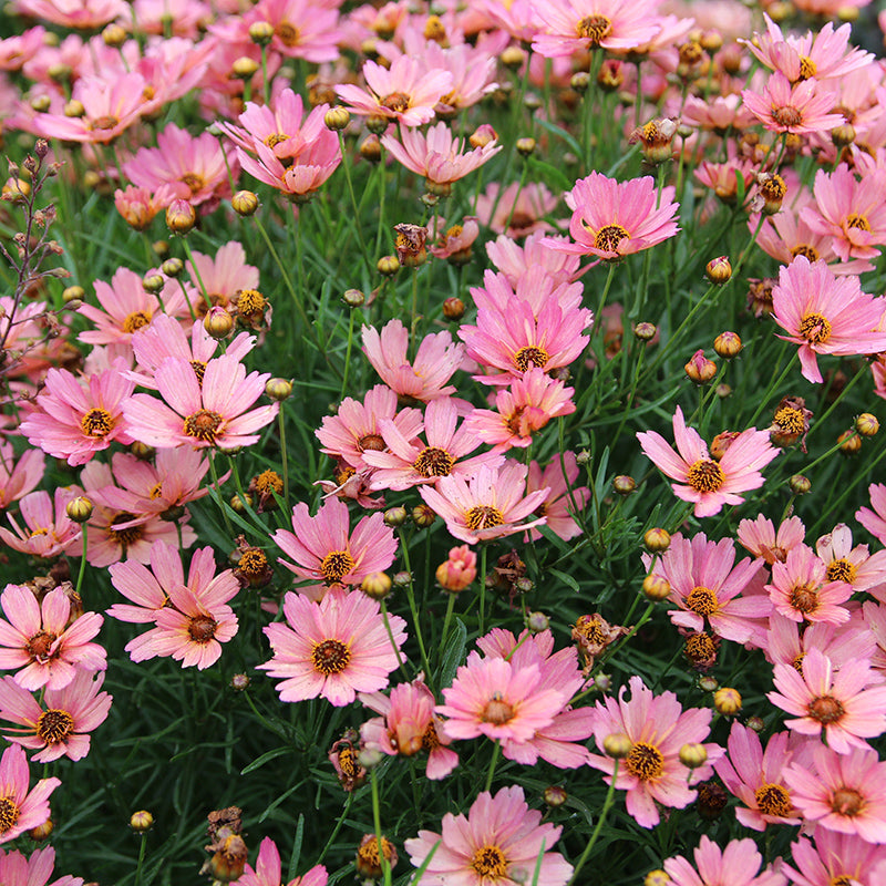 NOVA® Sunstone Coreopsis glows like a garden sunset, with coral-pink flowers that bloom from spring all the way to fall. This compact, mounded perennial reaches just 10–12 inches tall but makes a big impression—especially with pollinators, who flock to its floriferous, nectar-rich blooms.