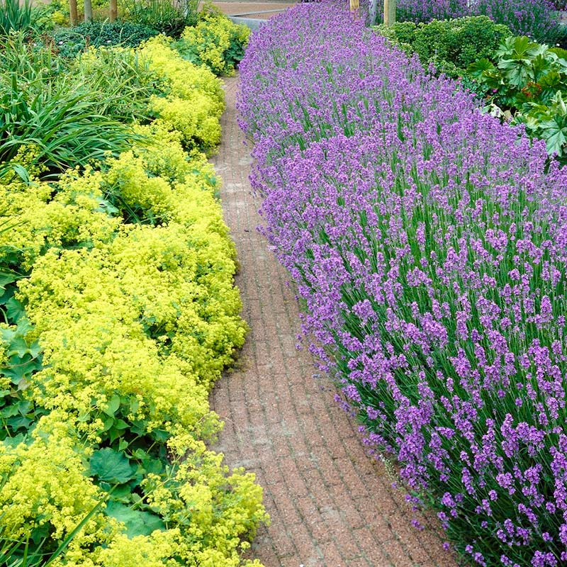 Lady's Mantle is a classic beauty long cherished for velvety, scallop-edged foliage and chartreuse blooms. Growing in soft mounds, the light green to olive foliage is ignored by deer and rabbits. Sprays of loosely clustered flowers create an airy halo above the plants in late spring and early summer. Lady's Mantle makes a lush groundcover and easy complement many other perennials. With a luxuriously soft, touchable texture, tuck these plants into a cottage gardens or grow at the edge of a path. (Alchemilla mollis)