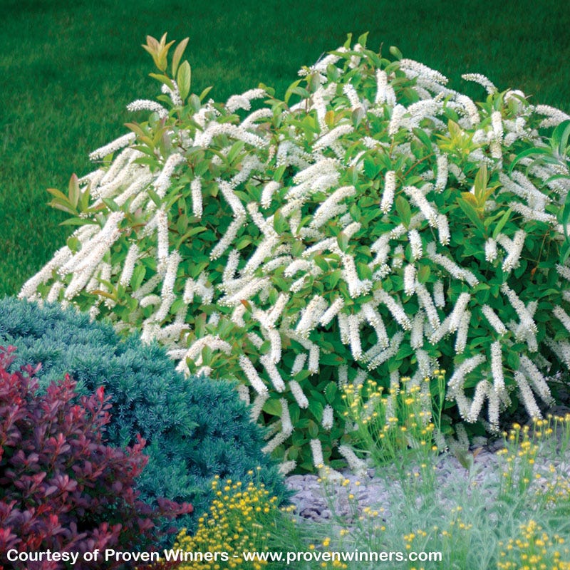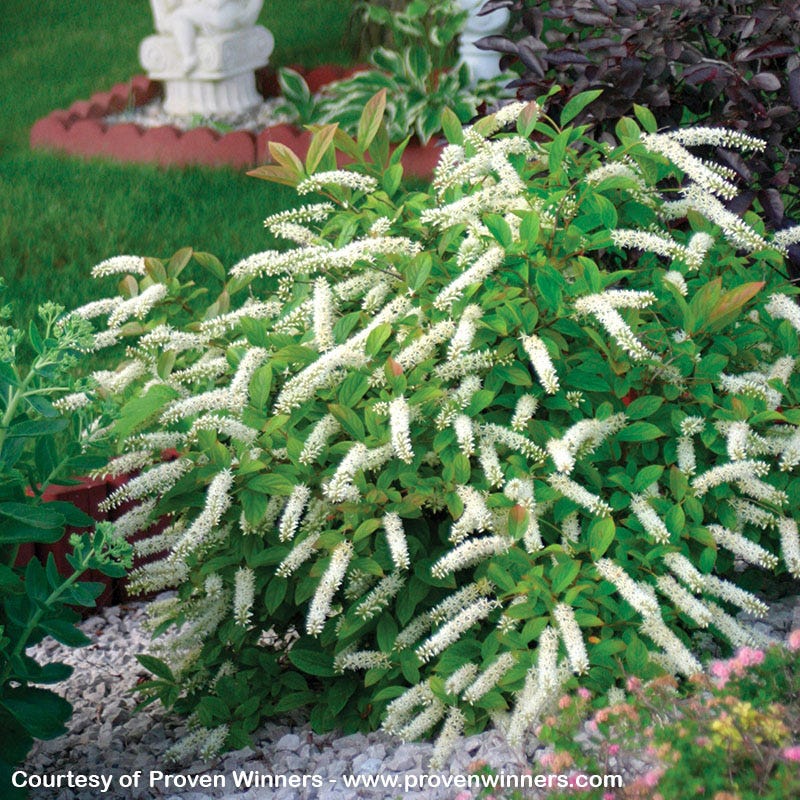 Little Henry® Sweetspire delights with soft fragrance, summer blooms, and gorgeous fall foliage. A flush of white flowers drapes the shrub each summer, dangling in long tubular clusters and drawing pollinators to the garden. This selection of the North American native shrub has more compact, mounded growth and fiery red and orange autumn foliage. (Itea virginica Sprich)