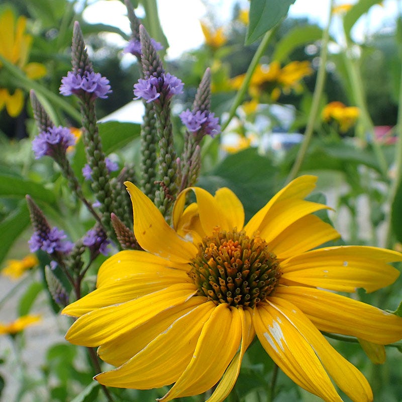 Blue Vervain forms impressive spikes of tiny blue-violet flowers that rise above neighboring plants. This easy-to-grow perennial wildflower adds a lovely vertical accent without overpowering. With an extended bloom time, this native flower is an important food source for birds and pollinators when many summer flowers have passed. Blue Vervain also tolerates wet soil, for a beautiful addition to rain gardens.(Verbena)