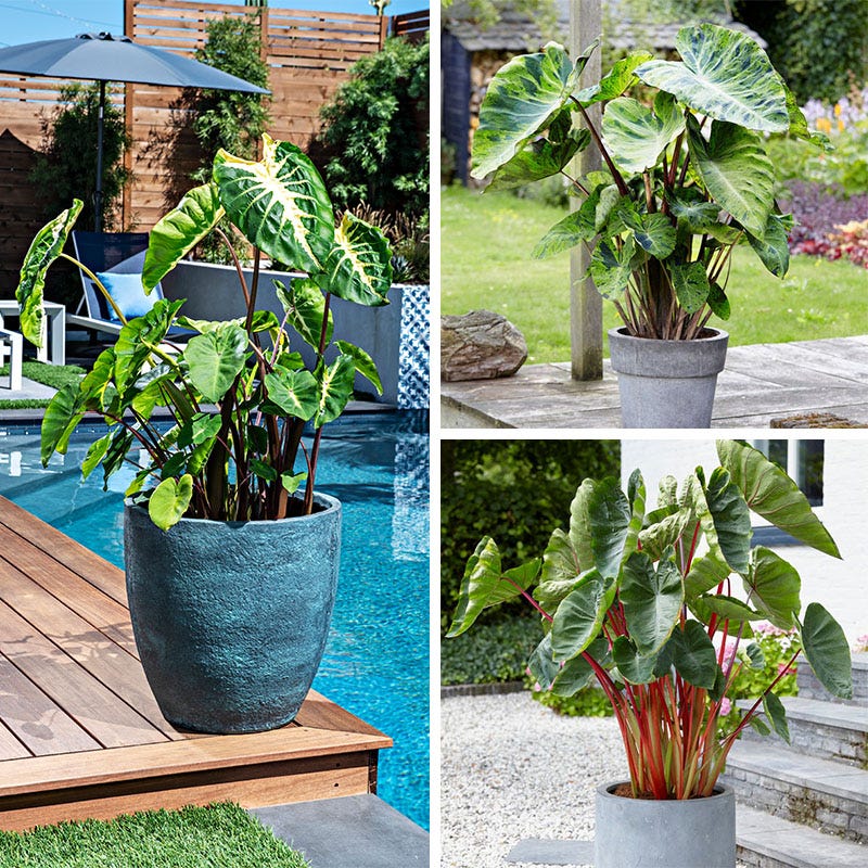 Our Touch of Drama Elephant Ear Collection features three favorite varieties of easy-to-grow tropical foliage. Gardeners love these easy-to-grow plants for their bold, architectural foliage to help give definition to outdoor spaces and to complement colorful flowers. Plant in spring when the soil has warmed in a full- to part-sun location in wet or moisture-retentive soil, and feed and water regularly for best results. Elephant Ears are also popular houseplants and can be grown in large containers with plenty of watering and added humidity. Elephant Ears are perennial in zones 7-10; In cooler zones, these bulbs can be dug after frost comes, stored over winter, then re-planted the following spring; if planted in containers, store in a frost-free place over the winter.