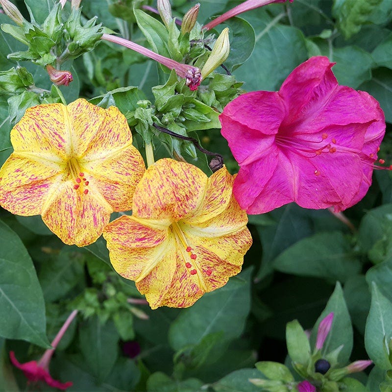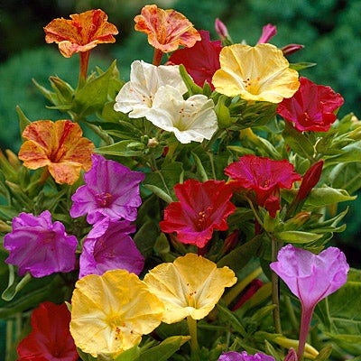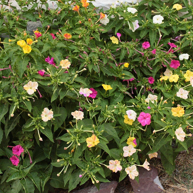 Four O'Clocks, sometimes called 'Marvel of Peru', are low-growing, bushy plants with flowers that bloom in several colors on the same plant - often on the same trailing stem. Four O'Clocks tolerate average-to-poor soils beautifully, making them a favorite for sun and part-sun sites that haven't gotten much attention in the past. Blooms open every afternoon (around 4 o'clock) and have closed by the next morning. (Mirabilis jalapa)