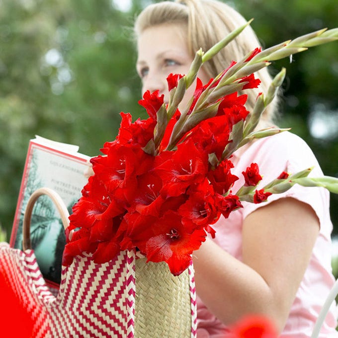 'Traderhorn' Gladiolus sends crimson-red flowers with white throats to the garden's top row, blending beautifully with a backdrop of blue sky. These long-flowering summertime bloomers are deer-resistant and grow quickly in a single season; dig or 'lift' them to store indoors for replanting the following spring. (Gladiolus)