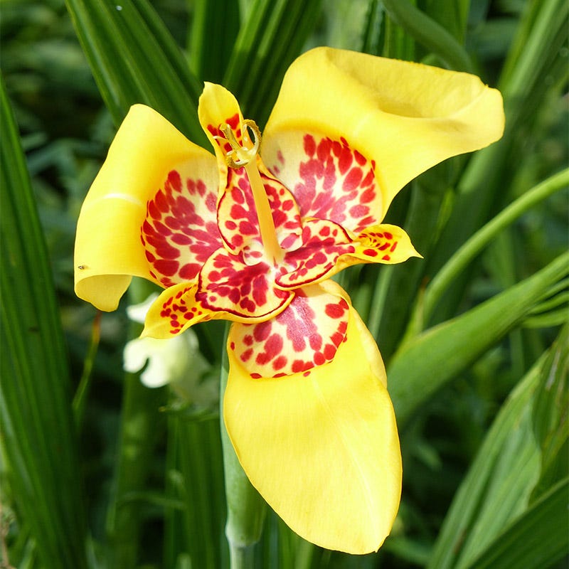 Tiger Flowers, also known as Mexican Shellflowers, produce 3-petaled, low-growing blooms in a mix of vibrant colors, with striking spotted centers. A close relative of the iris, these 3-6" wide blooms appear on straight, green blades. Perfect for planting in containers and hardy in zones 8-10. Considered an annual in all other zones. (Tigridia pavonia)